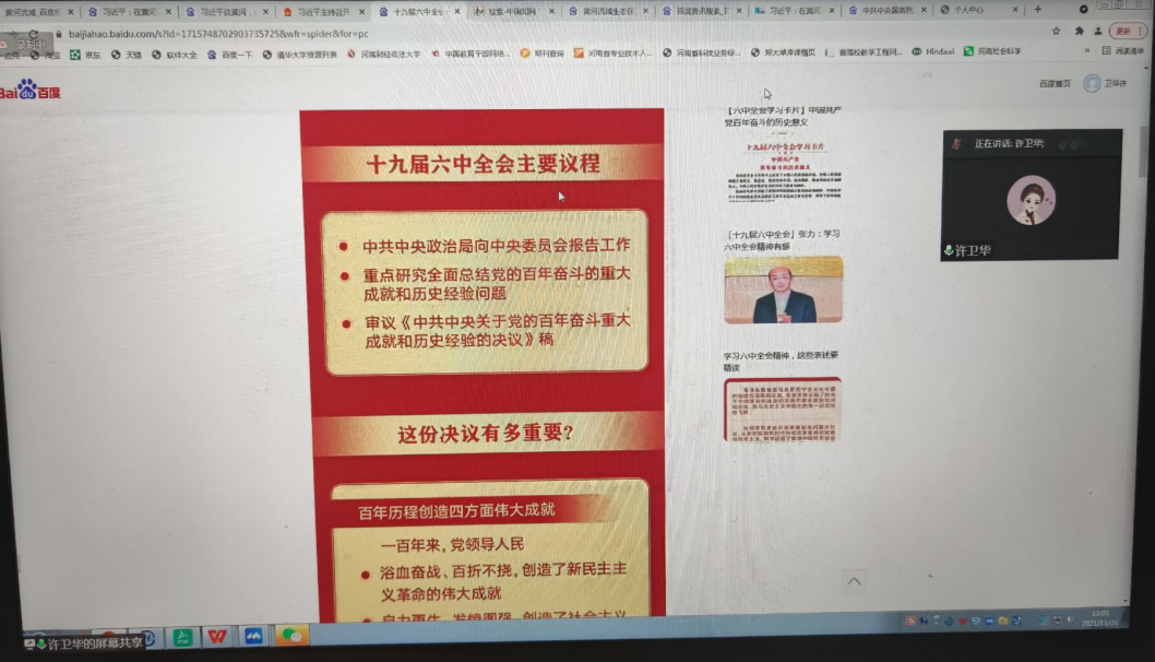 许卫华老师带领学员们对党的十九届六中全会精神进行全方位解读。她讲述了《中共中央关于党的百年奋斗重大成就和历史经验的决议》重要内涵,阐述了党百年历程的四个方面伟大成就,结合数十年来国家社会发展、科技变革、经济发展等各个方面的变化让学员们更直观地认识到中国共产党为什么行,社会主义制度为什么好。许老师强调今日的幸福生活来之不易,呼吁同学们要继续奋斗,发扬自强不息的精神,学会在总结过去经验中不断成长。