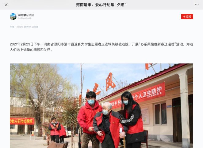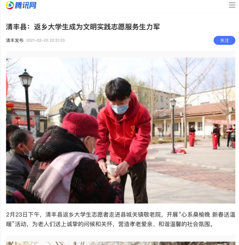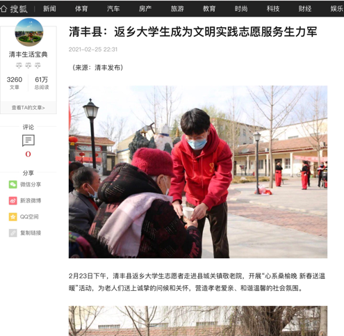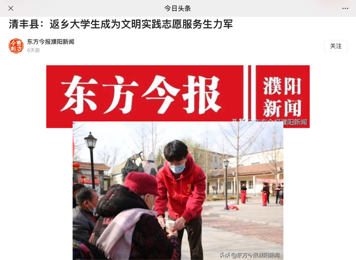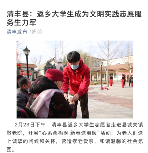 2021年寒假,伟德体育官网学生纪帅康返乡后积极响应号召,主动申请加入家乡濮阳市清丰县的暖爱志愿服务队,投身于社会文明志愿实践活动,用青春展现责任与担当。