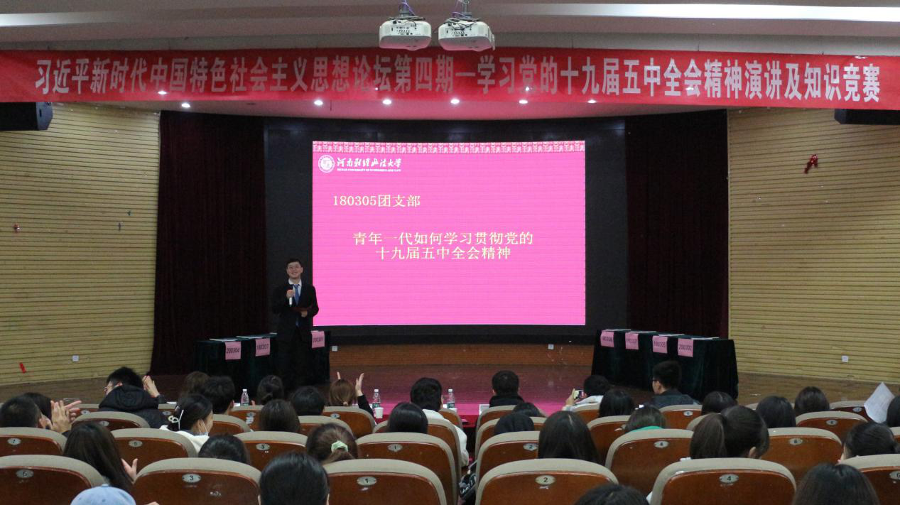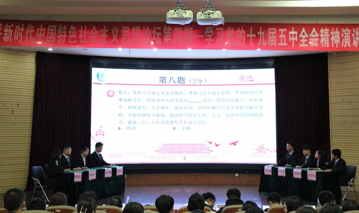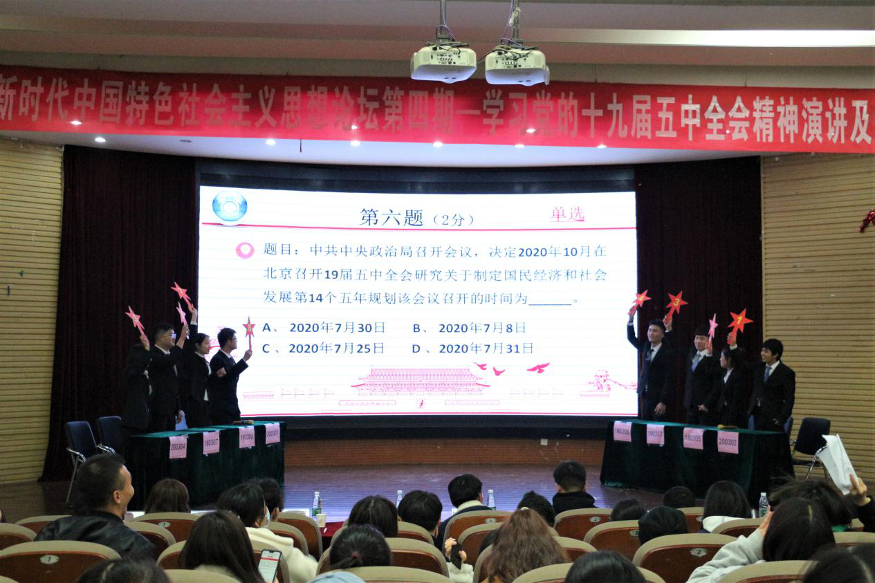 为深入学习宣传党的十九届五中全会精神,11月28日晚,伟德体育官网在教1—219报告厅举办第四期“习近平新时代中国特色社会主义思想论坛”——学习宣传党的十九届五中全会精神,近300名学生参加活动。