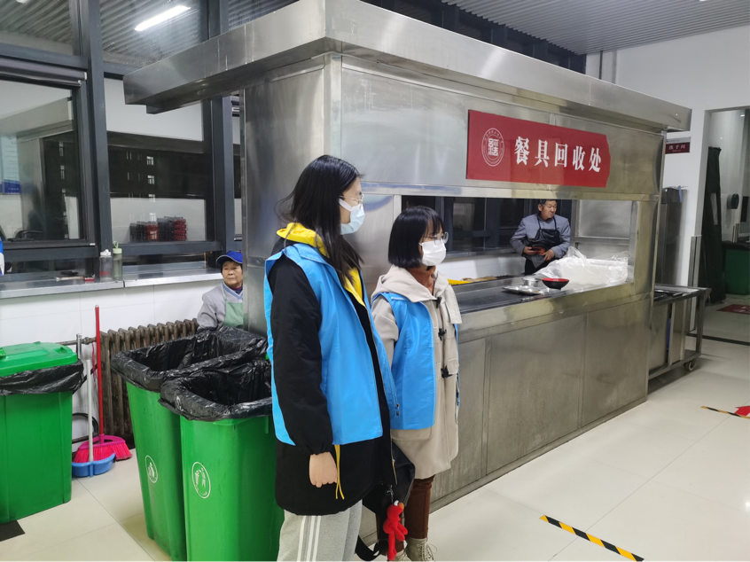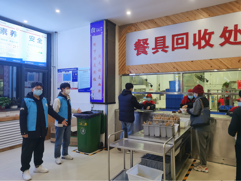 42名志愿者学生深入学校第二餐厅,分工分区协作,引导就餐同学间隔1米距离排队、按照标志位置就坐,提醒同学们在不用餐时戴好口罩做好个人防护,并及时制止餐饮浪费行为。志愿者们捡起掉落的筷子勺子、清扫倾洒的饭菜、清理地面的汤渍......餐厅的各个角落都活跃着他们的身影。志愿者们的行动得到现场同学的积极响应,同学们自觉遵守餐厅疫情防控管理,文明就餐,餐厅环境井然有序。