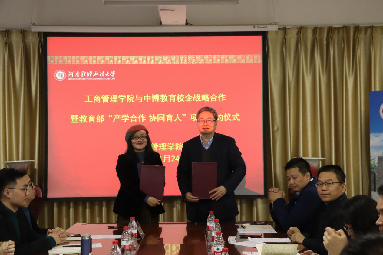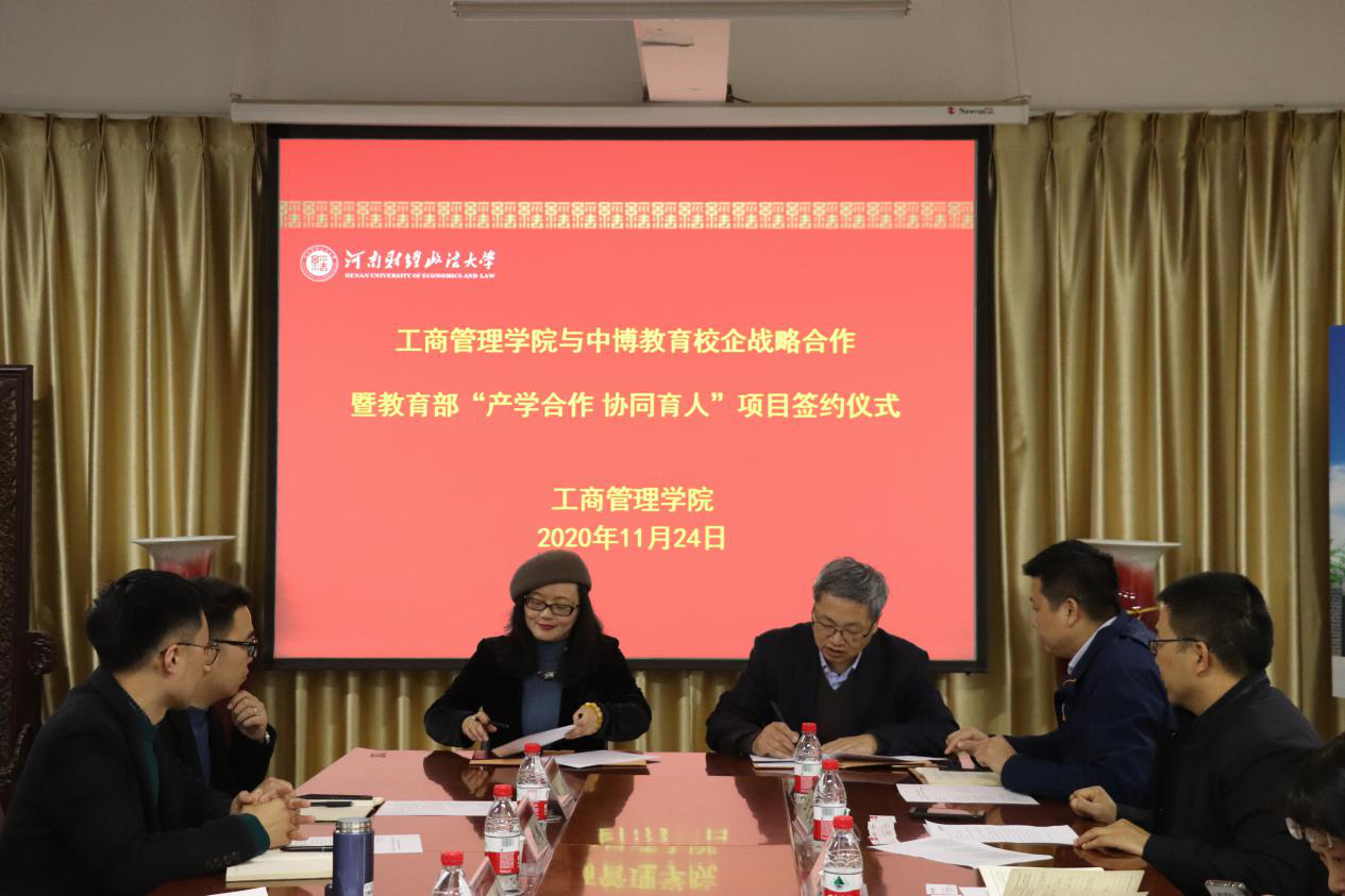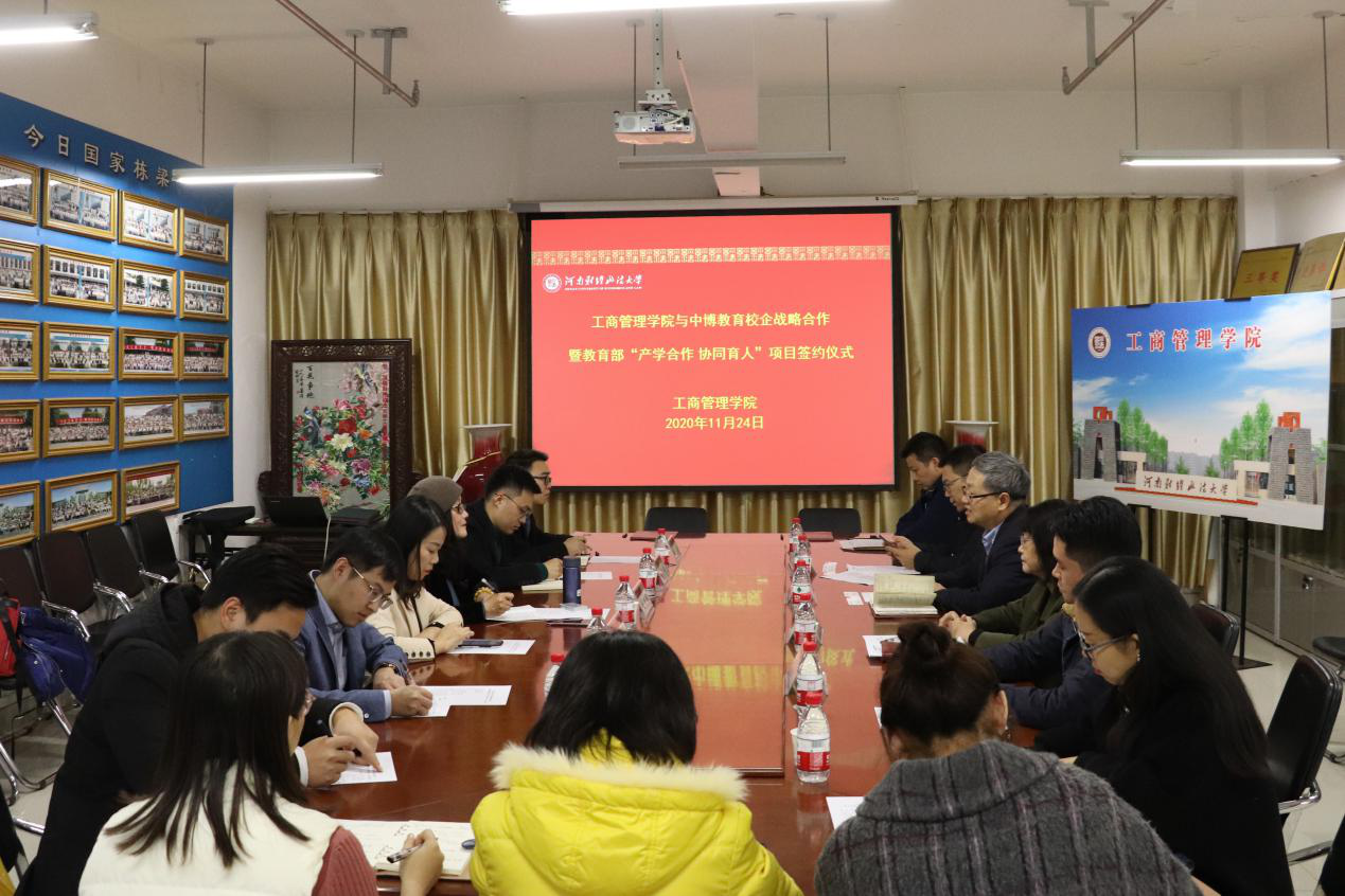 2020年11月24日下午,伟德体育官网与中博教育股份有限公司(以下简称:中博教育)校企战略合作暨教育部“产学合作,协同育人”项目签约仪式在教科楼771会议室举行。学院院长牛全保、党委副书记赵辉、副院长王文超、中博教育副总裁毛劲梅等双方相关人员参加了签约仪式。