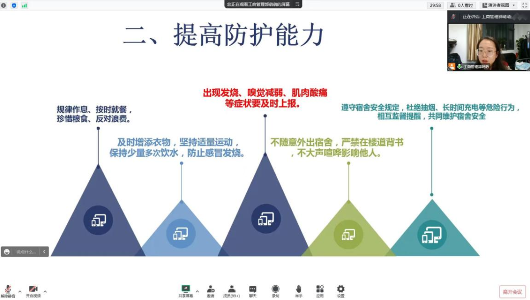 此次主题班会通过新媒体手段,做到了把形势讲明白,把责任讲到位,把要求讲清楚,鼓励同学们进一步强化防控意识,提高自我防护能力,处理好宿舍成员关系,协调好宿舍氛围,维持良好学风,争做志愿者,和学校一起共渡难关。