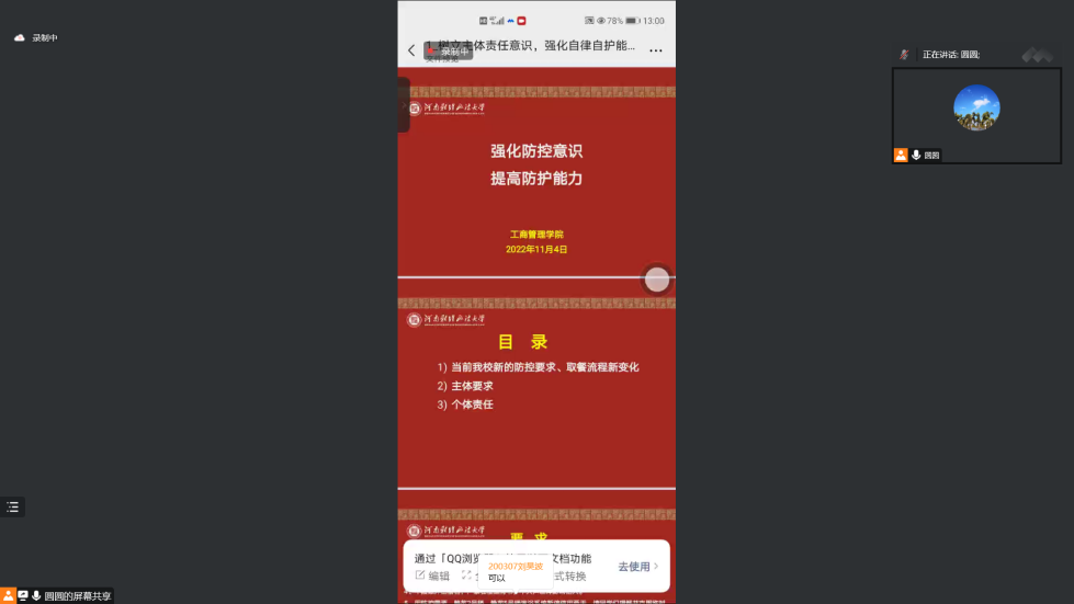 辅导员向同学们讲解了学校新的防控要求,并针对不同年级特点强调了注意事项。赵绍春、郭江涛教育引导毕业年级学生严格服从学校疫情防控管理制度,坚持考研学习和就业两手抓,鼓励同学们安心学习备考,调整考试心态,讲究学习方法,做好情绪疏导,规律作息,加强体育锻炼,发扬互帮互助精神,以最好的状态完成考研冲刺,以最积极的态度实现更高质量就业。郭媛园提醒宿舍长、学生党员发挥模范带头作用,协助二级网格长积极开展工作。提醒同学们在宿舍生活中相互尊重,和谐相处,建议同学们多换位思考,把重心放在学习主业上,按照自己的规划进行学习,积极配合老师上好网课。唐璐强调了分餐注意事项,要求取餐同学在取餐过程中始终保持同宿舍为一组,严格遵循“一组上一组下”的原则,减少人员交叉,学会保护自己,更好地服务同学。郭萌萌以寝室长职责为核心,提出宿舍长应发挥好关键作用,关注寝室成员身体健康状况,组织做好核酸检测、抗原检测,规范完成各类凭证提交等其他疫情防控相关工作。