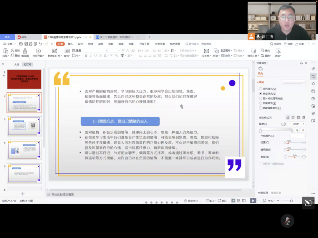 在学校疫情防控攻坚的关键时期,伟德体育官网迅速落实党委学工部工作安排,组织各年级专兼职辅导员于11月4日利用钉钉、腾讯会议等平台召开以“强化防控意识,提高防护能力”为主题的线上班会,做到了年级全覆盖、学生共参与。