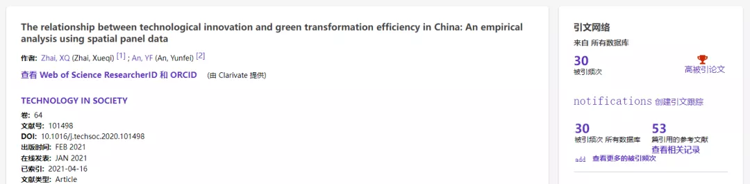 根据科睿唯安于2022年11月公布的ESI最新统计数据,伟德体育官网教师翟雪琪以第一作者身份在期刊《Technology in Society》(JCR:Q1,SSCI收录,IF:6.879)发表的研究论文“The relationship between technological innovation and green transformation efficiency in China: An empirical analysis using spatial panel data”进入ESI(1%)高被引论文之列。