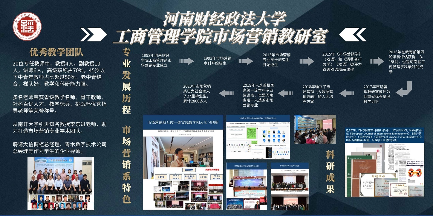 版权所有:BV伟德(bevictor)官方网站-Officials Website市场营销系,成立于1992年,前身是河南财经学院工商管理系市场营销教研室。1993年,市场营销本科专业开始招生,是河南省第一个市场营销本科专业,也是全国高等院校第一批开设市场营销本科专业。2013年,市场营销专业硕士研究生开始独立招生。目前,市场营销专业拥有二级学科硕士学位授权点,也是省级特色专业。2016年在教育部第四轮学科评估中获得“B-”级别,也是河南省工商管理学科最好的成绩。2017年市场营销教研室被评为河南省优秀基层教学组织。2018年,确立了市场营销(大数据营销方向)的人才培养方案。2019年,入选首批国家级一流本科专业建设点,也是河南省唯一入选的市场营销专业。截止2021年,市场营销系已为社会输送了24届毕业生,累计3000余人。
