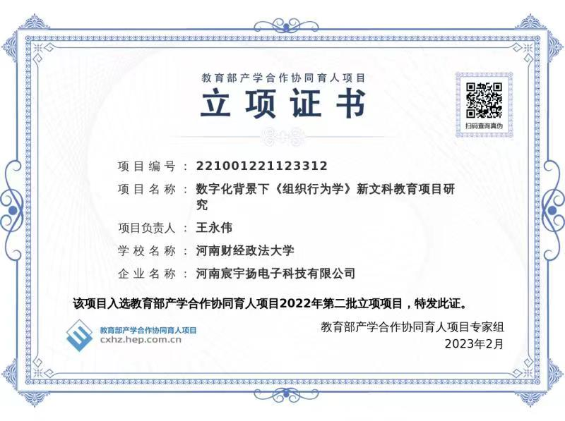 近日,教育部高等教育司公布了2022年第二批产学合作协同育人项目立项名单,院长王永伟博士主持的“数字化背景下(组织行为学)新文科教育项目研究”(项目编号:221001221123312)获得立项,项目合作方为“河南寰宇扬电子科技有限公司”,这是伟德体育官网连续第二年获批教育部协同育人项目。